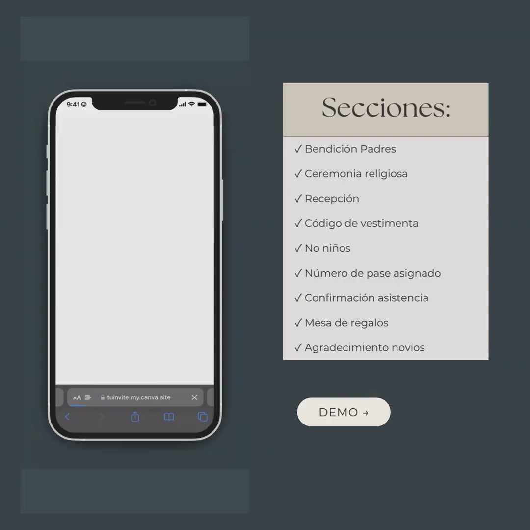 Crea una hermosa página web para tu boda con nuestra plantilla 100% editable en Canva — sin necesidad de experiencia en diseño o programación. Esta invitación digital moderna y elegante es la manera perfecta de compartir todos los detalles de tu gran día de la manera más práctica.